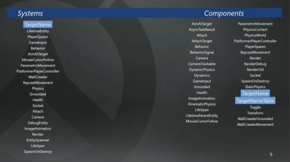 图的左手边是以轮询顺序排列的System列表,右边是不同实体拥有的组件。在左边选择不同的System以后,就像弹钢琴一样,所有对应的组件会在右边高亮显示,我们管这叫组件元组(译注,元组tuple,从后文来看,主要作用就是可以调用Sibling函数来获取同一个元组内的组件,有点虚拟分组的意思)。