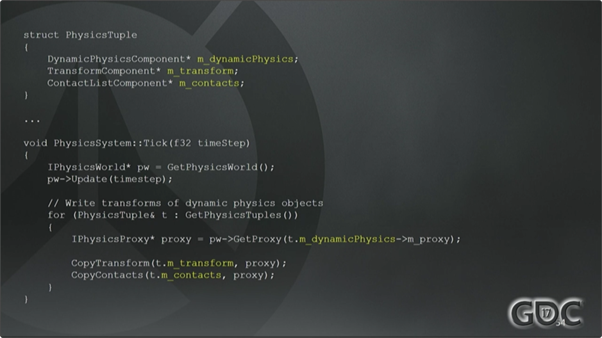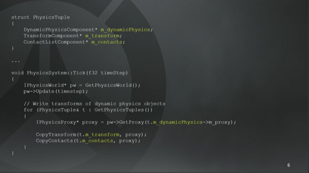 这个是物理System的轮询函数,非常直截了当,就是一个内部物理引擎的定时更新。物理引擎可能是Box2d或者是Domino(暴雪自有物理引擎)。执行完物理世界的模拟以后,就遍历元组集合。用DynamicPhysicsComponent组件里保存的proxy来取到底层的物理表示,并把它复制给Transform组件和Contact组件(译注:碰撞组件,后文会大量用到)。