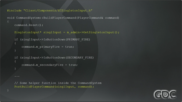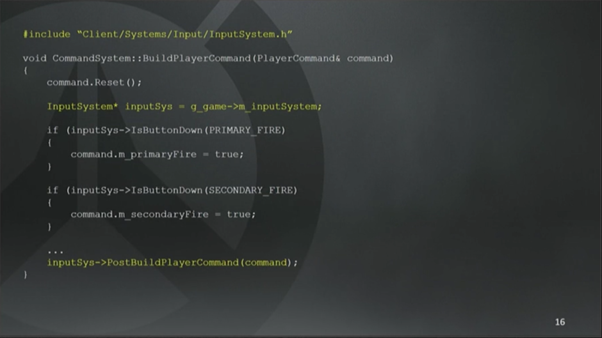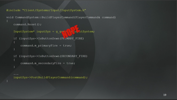 无论如何,这种方式撑了一阵子。我们在System里存储了一次性(one-off)的状态数据,然后提供了一个全局访问方式。从图16可以看到整个访问过程(译注:重点是g_game->m_inputSystem这一行)。