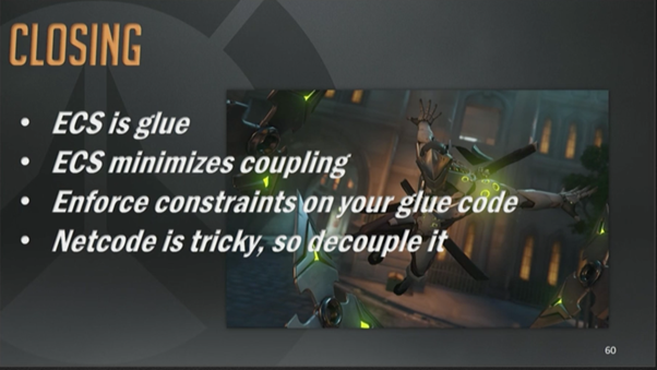 ECS是Overwatch的粘合剂,它很酷,因为它可以帮你用最小的耦合来集成大量分散的系统。如果你打算用ECS定义你的规范,实际上无论你想用什么架构来快速定义你的规范,应该都是只有少数程序员需要接触物理系统代码、脚本引擎或者音频库。但是每个人都应该能够用到胶水代码,一起集成系统。