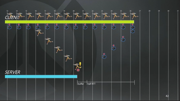 除了上面那个环形缓冲以外,我们还有另一个环形缓冲用来存储玩家的输入操作。因为处理移动的代码是确定性的,一旦玩家开始进入他想要进入到移动状态,想要重现这个过程也是很容易的。所以这里我们的处理方式就是,一旦从服务器回包发现预测失败,我们把你的全部输入都重播一遍直至追上当前时刻。如下图41中的第17帧所示,客户端认为猎空正在跑路,而服务器指出,你已经被晕住了,有可能是受到了麦克雷的闪光弹的攻击。