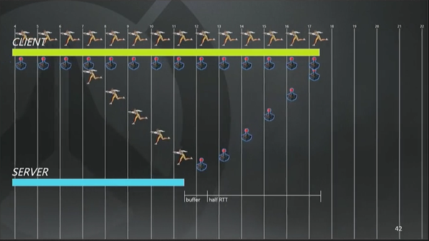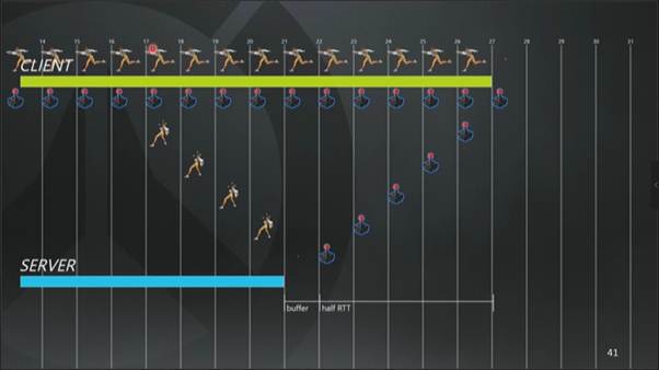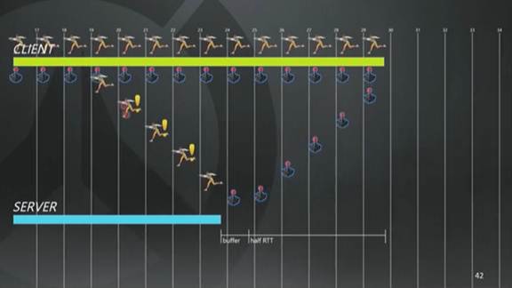 假定输出流是稳定的,那么客户端的始终总是会超前于服务器的,超前了大概半个RTT加上一个缓存帧的时长。这里的RTT是PING值加上逻辑处理的时间。上图39的例子中,我们的RTT是160毫秒,一半就是80毫秒,再加上1帧,我们每帧是16毫秒,全加起来就是客户端相对于服务器的提前量。