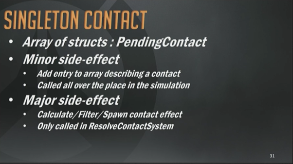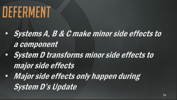 好的单例组件可以通过“推迟”(Deferment)来解决System间耦合的问题。“推迟”存储了行为所需状态,然后把副作用延后到当前帧里更好的时机再执行。