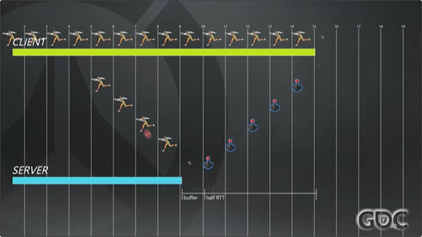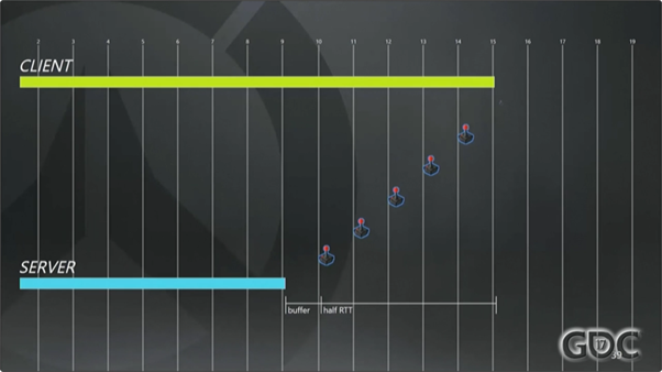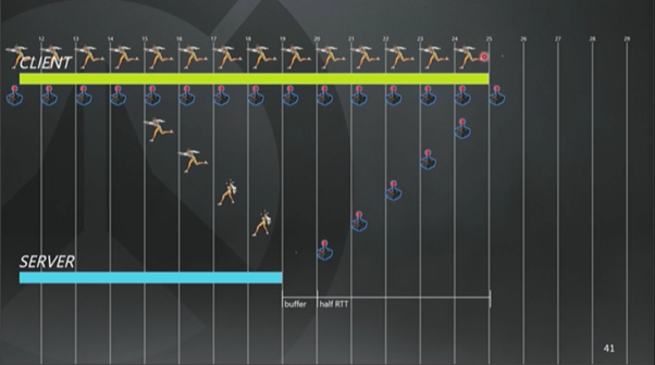 图中的垂直线代表每一个处理中的帧。客户端开始模拟并把第19帧的输入上报给服务器,过一段时间(基本上是半个RTT加上缓冲时间)以后,服务器才开始模拟这一帧。这就是我为什么要说客户端永远是领先于服务器的。