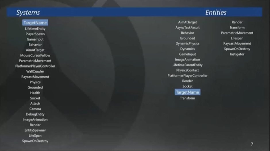 像这个原型引擎里的例子,(指着上图7中)这个是玩家角色实体,可以做出很多很酷的行为,右边这些是玩家能够发射的子弹实体。