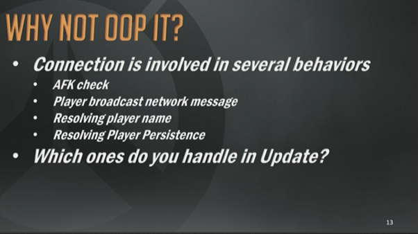 答案是,因为Connection组件会同时被多个行为所使用,包括:AFK检查;能接收网络广播消息的已连接玩家列表;存储包括玩家名称在内的状态;存储玩家已解锁成就之类的状态。所以(如果用传统OOP方式的话)具体哪个行为应该放在组件的Update中调用?其余部分又应该放在哪里?
