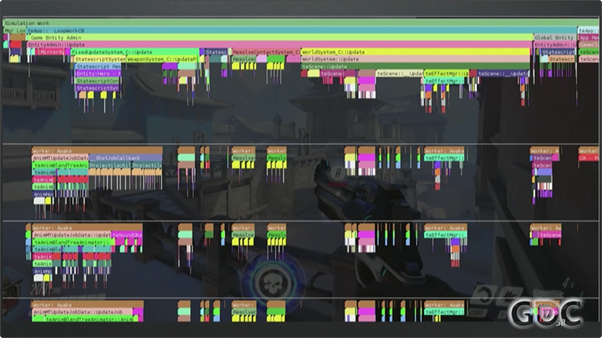 在线程模型中这些冰山的体型相当明显,大部分ECS的工作,例如更新System,都是发生在主线程(图58顶部)上的。我们也用到了大量的多线程技术,像fork和join。这个例子里,有角色发射了大量的抛射物,然后脚本System说我们需要生成一些抛射物,就创建了几个工作线程来干活。还有这里是ResolvedContactSystem想要创建一些碰撞特效,这里花费了几个工作线程去做这项工作。