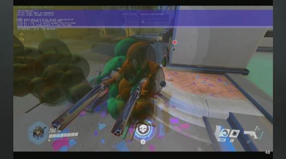 图47中的框是每一个实体的逻辑边界(bounding volumes)。逻辑边界基本上就是代表了这个源氏的实时快照的并集。所以源氏周围的逻辑边界就代表了过去半秒钟这个角色的全部运动(的最大范围)。如果我现在沿着准星方向射击,在倒回这个角色以前,会首先与这个边界相交,因为基于我的PING值,它有可能在边界内的任意一处位置。