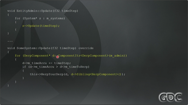 EntityAdmin的结尾部分会调用所有System的Update。每个System都会做一些工作。上图9就是我们的使用方式,我们没有在固定的元组组件集合上执行操作,而是选择了一些基础组件来遍历,然后再由相应的行为去调用其他兄弟组件。所以你可以看到这里的操作只针对那些含有Derp和Herp组件的实体的元组执行。