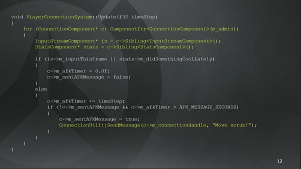 上面System的更新行为会带来了一个疑问:为什么不能使用传统的面向对象编程(OOP)的组件模型呢?例如在Connection组件里重载Update函数,不停地跟踪检测AFK?