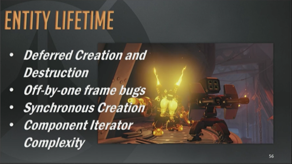实体生命周期管理需要一些技巧,尤其是在一帧的中间创建出来的那些。在早期,我们推迟了创建和销毁行为,当你说“嘿我想要创建一个实体时”,实际上是在那一帧结束时才完成的。事实证明,推迟销毁一点问题都没有,而推迟创建却有一大堆副作用。尤其是当你在System A 中申请创建一个新的实体,然后在System B中使用,这时如果你推迟了创建过程,你就要隔一帧才能使用。