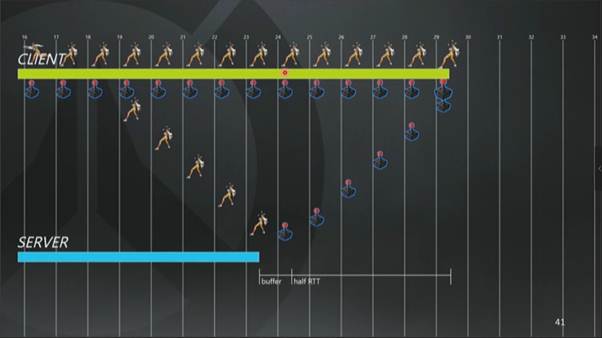 现在客户端进行到第27帧(上图)了,这时我们收到了服务器上第17帧的回包。一旦重新同步(译注:注意下图41中客户端猎空的状态全都更正为“晕”了)以后,就相当于回退到了“帧同步”(lockstep)算法了。