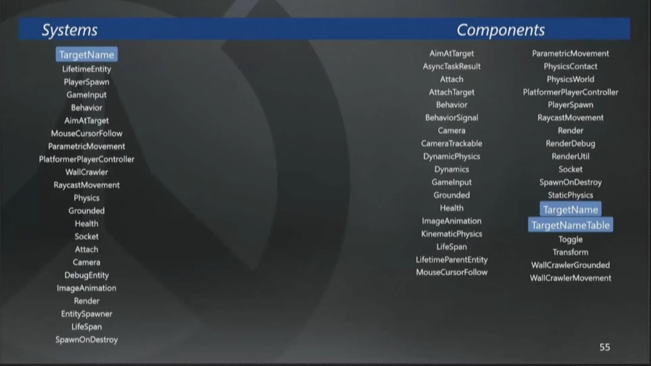 举个例子,大量代码都会关心“敌对关系”,例如,实体A与实体B互相敌对吗?敌对关系是由3个可选组件共同决定的:filter bits,pet master和pet。filter bits存储队伍编号(team index);pet master存储了它所拥有全部pet的唯一键;pet一般用于像托比昂的炮台之类。