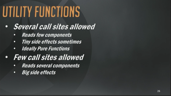 一旦我们把某些System状态移到单例中,会把共享的System函数分解成Utility(实用)函数,这些函数需要在那些单例上运行,这又有点耦合了,我们接下来会详细讨论。