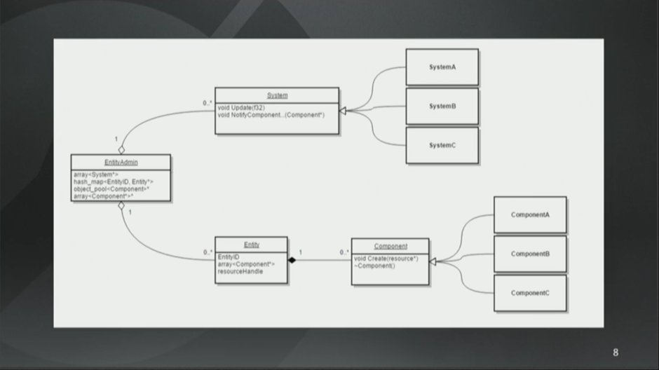 EntityAdmin是个World,存储了一个所有System的集合,和一个所有实体的哈希表。表键是实体的ID。ID是个32位无符号整形数,用来在实体管理器(Entity Array)上唯一标识这个实体。另一方面,每个实体也都存了这个实体ID和资源句柄(resource handle),后者是个可选字段,指向了实体对应的Asset资源(译注:这需要依赖暴雪的另一套专门的Asset管理系统),资源定义了实体。