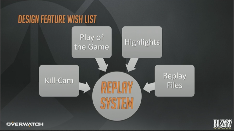 这次分享的标题就预示着必须给出答案,对吧?概要需求是创建一个单一的中央系统,能够支持阵亡镜头、全场最佳和亮眼表现,除此之外我们还特别需要能够生成录像文件,在开发期间可以用来做内部调试。
