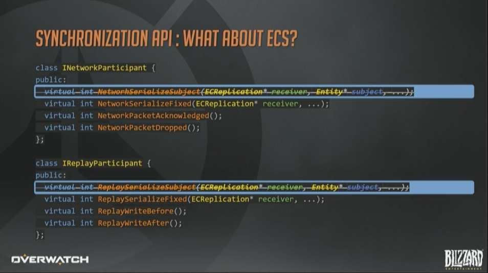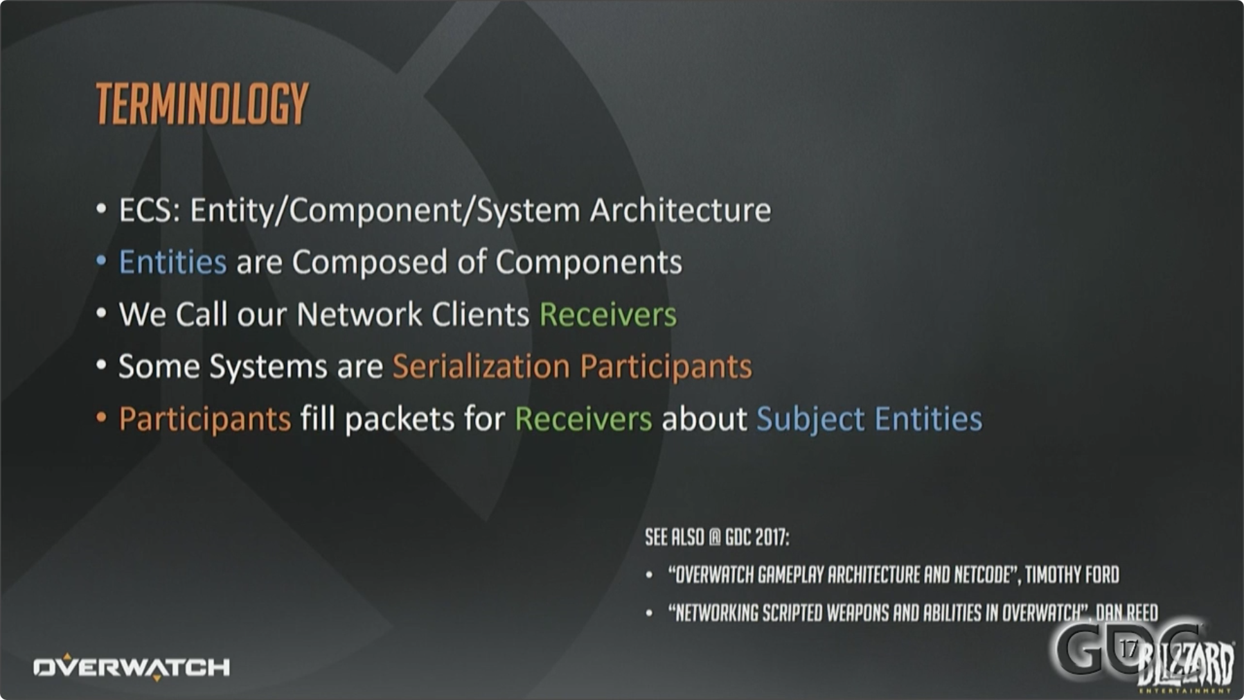 先介绍几个术语,Overwatch使用的是ECS架构:实体是由组件组成的,由System负责更新(译注:关于ECS请读者参考另外一篇分享:GDC2017 Overwatch Gameplay Architecture and Netcode)。