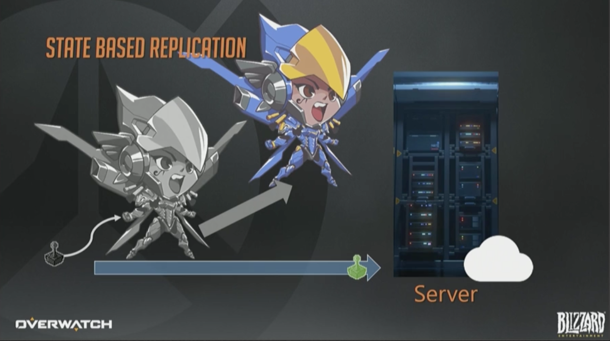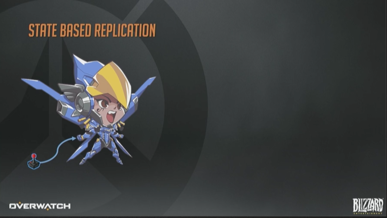 下面来个具体点的例子,假定你正在控制法拉(Overwatch英雄之一)你跳了一下然后飞起来准备低空轰炸,这个消息是如何发给其他玩家的呢?