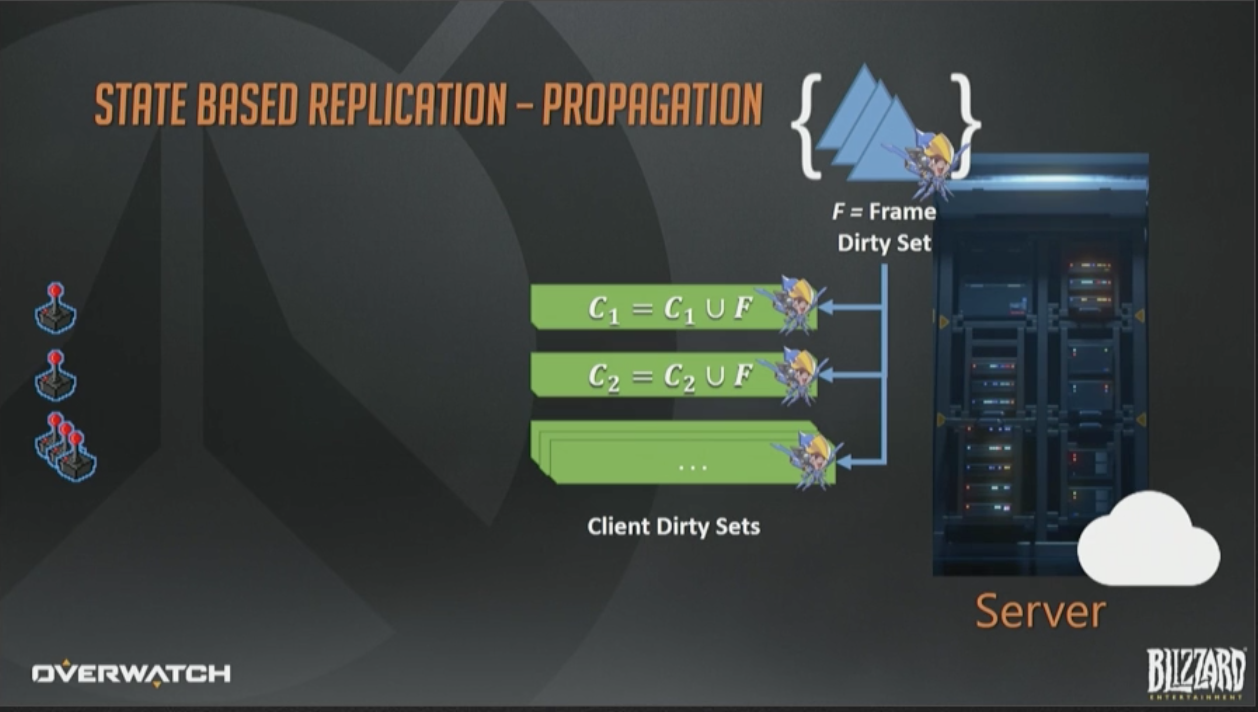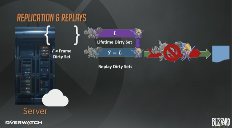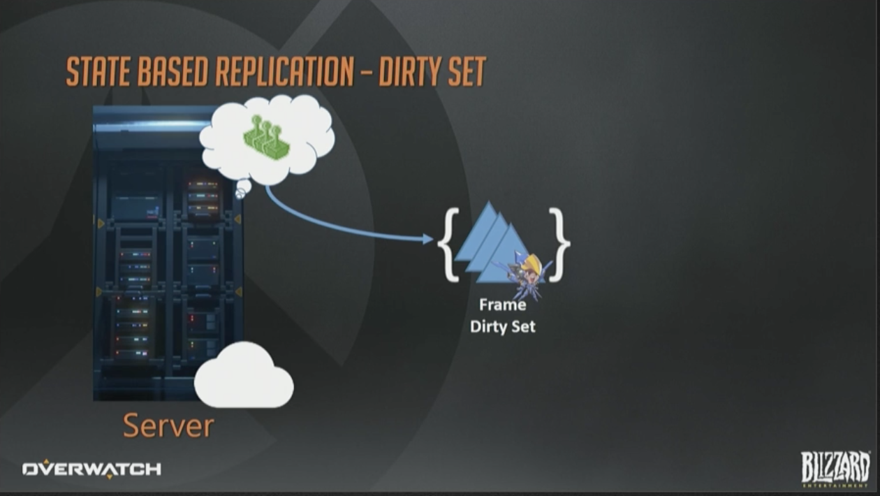 在服务器端,我们会累积所有对象状态的变化,然后保存在一个临时的“每帧脏数据集合”(per frame dirty set)里。可以简单地认为它就是个字面意义的数学概念的集合,包含所有在那一帧发生改变的实体的ID。