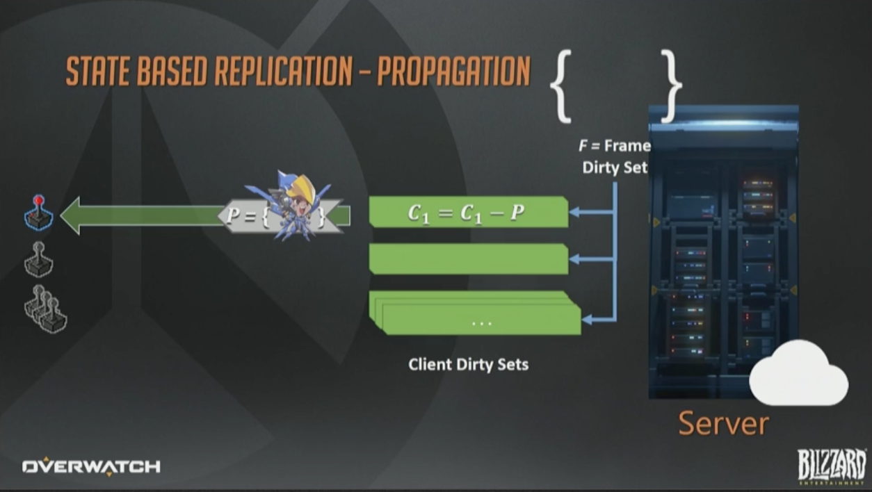 那如何把这些状态转发给客户端呢?我们对每个已连接的客户端也维护了一个“脏集合”(译注:应该指的是C1, C2…作者没有交代这些集合是如何生成的,不过从下文的C1=C1-P可以推测出来)。这一页幻灯片右上方的F是当前帧脏集合。每帧结束时,所有接收者的脏集合会与帧脏集F合并(还是数学上的并集概念),这样数据打包时就可以只包含那些该客户端真正需要的实体集合了。在帧结束时,这些操作都做完以后,帧的脏集会被清空,下次更新(tick)时,一切重头开始。
