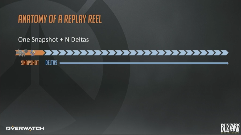 基于快照同步实现回放系统的话,十分简便。从一个完整世界状态开始,更新每帧时添加差异就好了。广义上讲,这个方案就是依赖新技术的游戏客户端如何播放录像文件的问题。客户端要做的仅仅是把网络游戏数据序列化到硬盘上。
