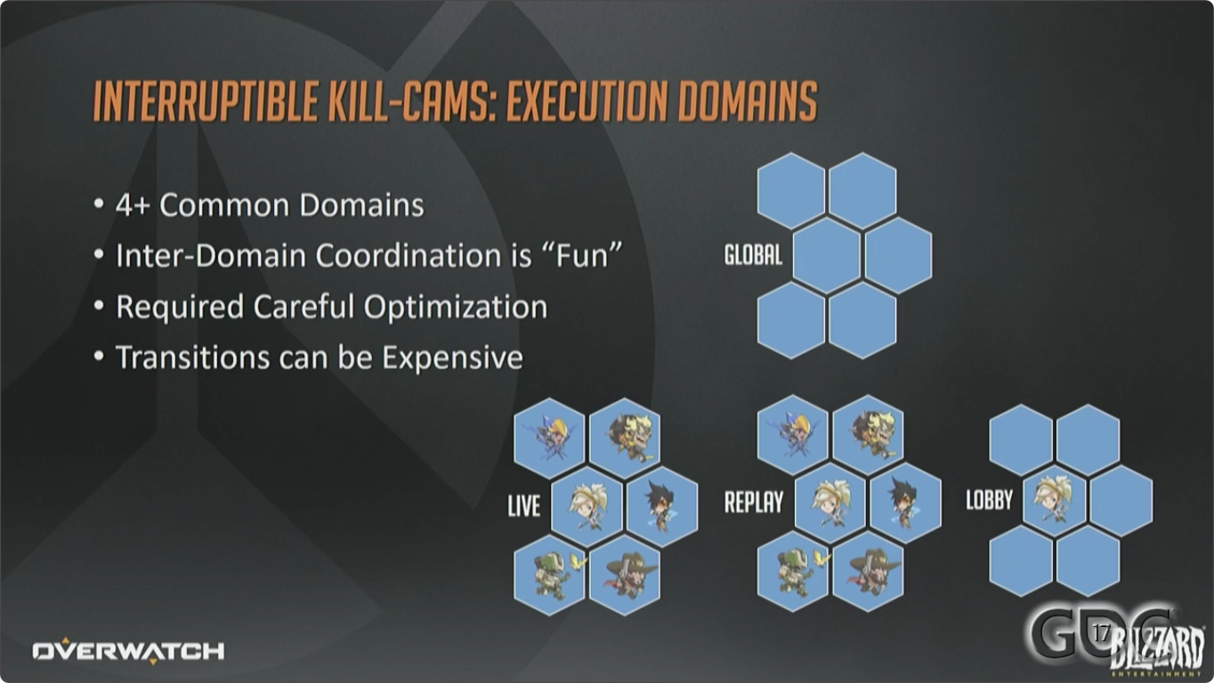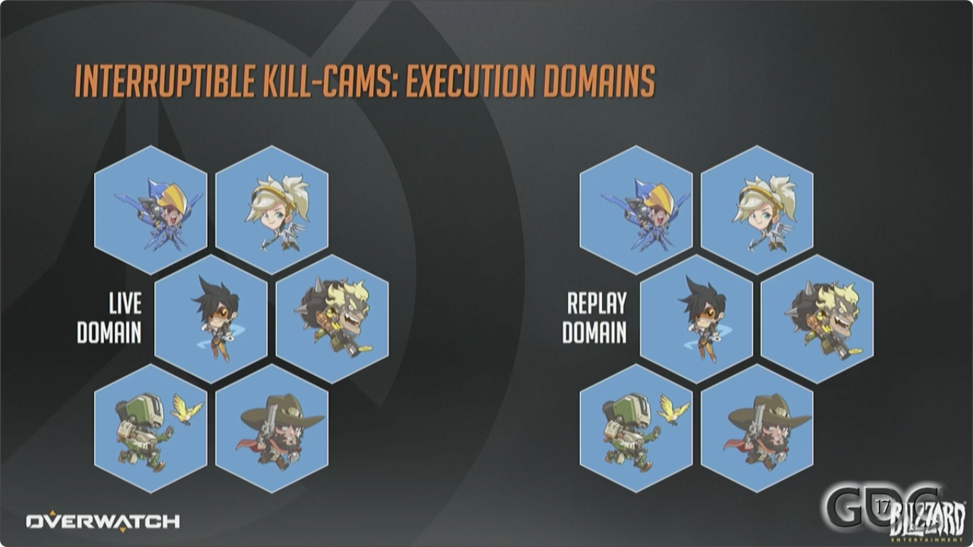 大概花了几周的时间,我们把所有东西都隔离了,并且有了两个域(Domain),一个做实时游戏,一个做回放。在这个模型里,实时游戏数据来自网络,直接进入实时渲染的世界里。而来自回放的数据块直接进入了回放模块。进入阵亡镜头时,实际上两个域的数据都在同时处理。