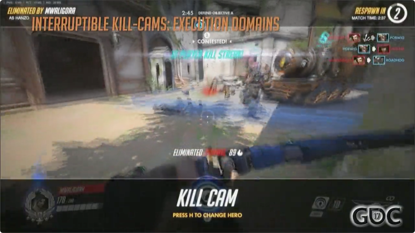 上面展示的视频例子(狂鼠被半藏杀死的例子)中,可以看到死亡过程中的几个关键节点,玩家死亡时有3件值得注意的事:玩家尸体布偶化(ragdoll,也叫布娃娃,专用术语,全称Ragdoll physics,是用在电子游戏的物理引擎中代替传统静态动画的可变性角色动画系统),方便判断死亡方式(译注:估计说的是炸死、摔死还是射死等);游戏镜头朝向凶手;凶手轮廓描边,即使隔着墙也可以看见,从而使你查看得更加清楚(译注:这一点在视频中没有得到展示)。