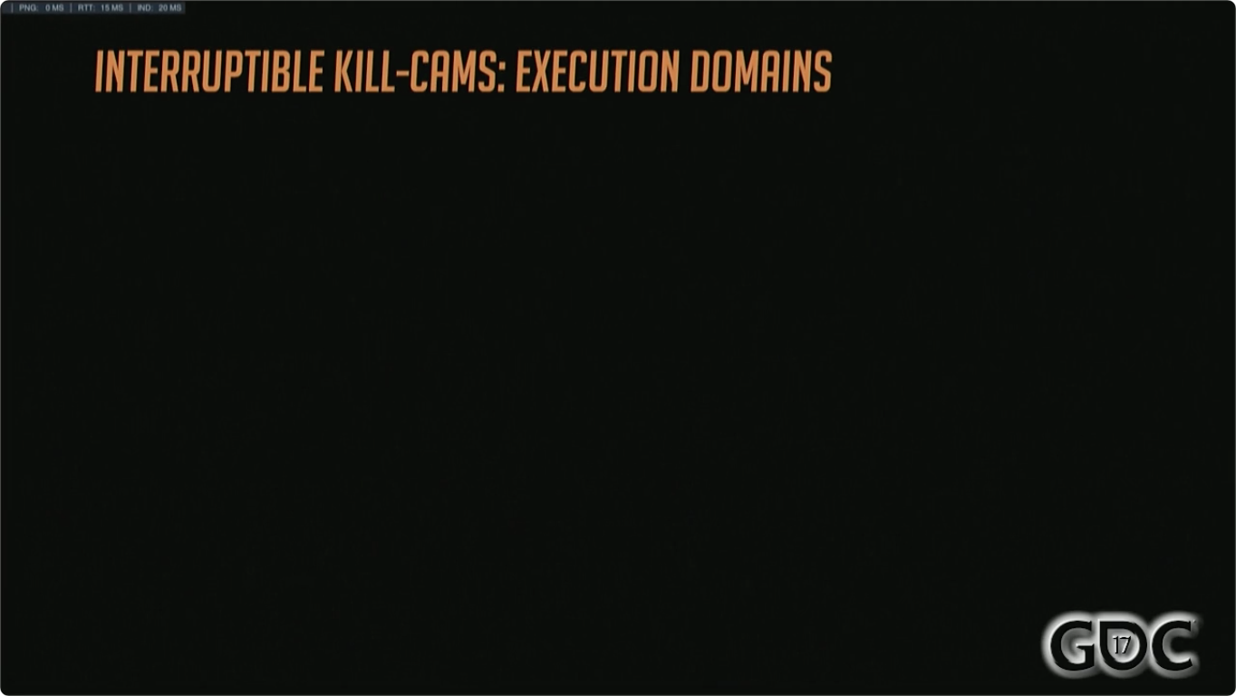 哦,这部分是我的最爱:可打断的阵亡镜头。“复活”是个麻烦事,因为我们已经把“卷”发给客户端了,客户端也开始播放了。但是因为回放随时可能被取消或者打断,所以我们不能完全销毁live世界的状态,也不能停止接收live的网络数据,因为live的游戏脚本可能会需要根据这些数据控制UI、特效,触发事件来表明你被“复活”了。