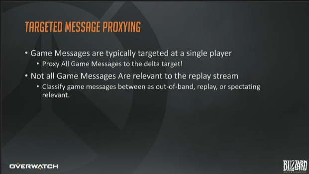 为了实现这一点,我们把每个游戏消息都加上注释,来指定它是否需要被包含到回放或者观战数据流当中。然后在把这些消息委托给适当的接收者。