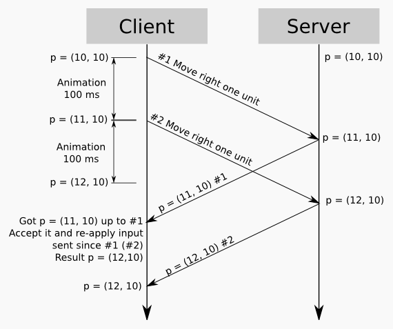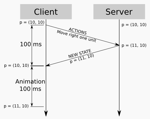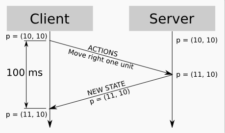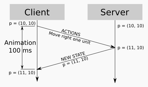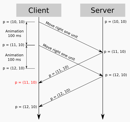 A naive implementation of this scheme leads to a delay between user commands and changes on the screen; for example, the player presses the right arrow key, and the character takes half a second before it starts moving. This is because the client input must first travel to the server, the server must process the input and calculate a new game state, and the updated game state must reach the client again.