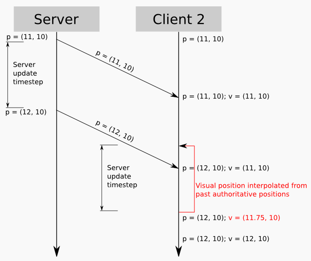 Client 2 renders Client 1 “in the past”, interpolating last known positions.
