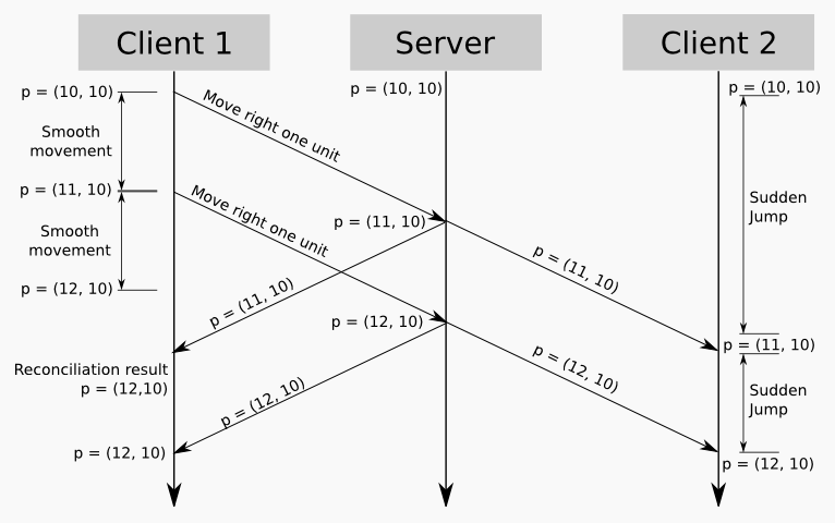 However, if nothing else is done, the illusion breaks down when an event needs high spatial and temporal accuracy, such as shooting at a moving target: the position where Client 2 renders Client 1 doesn’t match the server’s nor Client 1′s position, so headshots become impossible! Since no game is complete without headshots, we’ll deal with this issue in the next article.