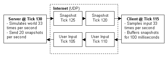 Multiplayer games based on the Source Engine use a Client-Server networking architecture. Usually a server is a dedicated host that runs the game and is authoritative about world simulation, game rules, and player input processing. A client is a player’s computer connected to a game server. The client and server communicate with each other by sending small data packets at a high frequency (usually 20 to 30 packets per second). A client receives the current world state from the server and generates video and audio output based on these updates. The client also samples data from input devices (keyboard, mouse, microphone, etc.) and sends these input samples back to the server for further processing. Clients only communicate with the game server and not between each other (like in a peer-to-peer application). In contrast with a single player game, a multiplayer game has to deal with a variety of new problems caused by packet-based communication.