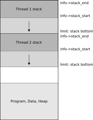 In a multi-threaded environment like Mono using a single pointer would introduce additional costs because we would have to do at least a compare-and-swap to increment it, potentially looping because it might fail due to contention. The standard solution to this problem is to give each thread a little piece of the nursery exclusively from which it can bump-allocate without contention. Synchronization is only needed when a thread has filled up its piece and needs a new one, which should be far less frequent. These pieces of nursery are called “thread local allocation buffers”, or “TLABs” for short.