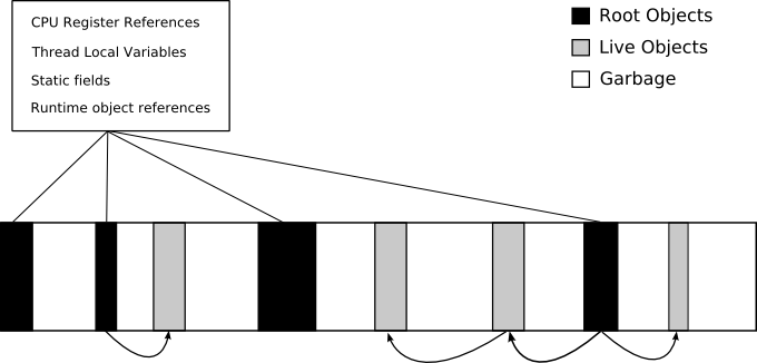 The garbage collector, in short, is that part of the language’s or platform’s runtime that keeps a program from exhausting the computer’s memory, despite the lack of an explicit way to free objects that have been allocated. It does that by discovering which objects might still be reached by the program and getting rid of the rest. It considers as reachable objects those that are directly or indirectly referenced by the so-called “roots”, which are global variables, local variables on the stacks or in registers and other references explicitly registered as roots. In other words, all those objects are considered reachable, as well as those that they reference, and those that they reference, and so on.