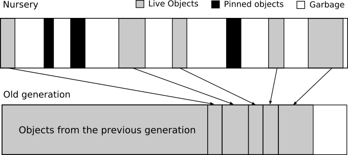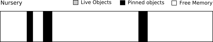 What has to happen at this point, though, is to take score of the regions of nursery memory that are available for allocation, which means everything apart from pinned objects. Since we have a list of all pinned objects this is done very efficiently. It is these “fragments” from which TLABs will be assigned in the next mutator round.